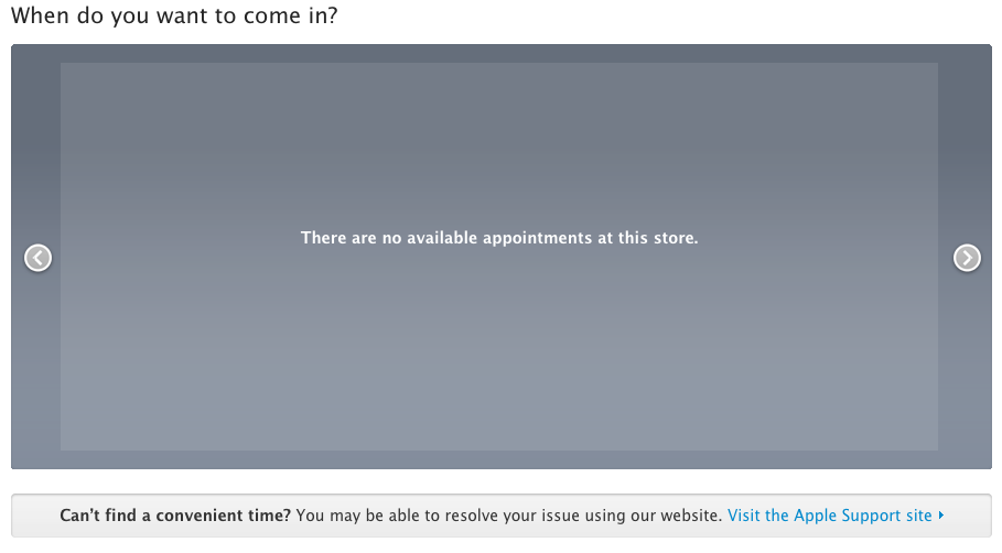 我上个周五去修 Macbook Pro,我知道需要提前预约而且只能预约当天,于是周四半夜就开始刷预约(因为我也不知道什么时候可以开始预约,就半夜开刷),11点58、59刷了两三次,12点过一点又刷了3、4次,全部结果都是错误页面(就是前面提到的 Error Processing),早上9点起床再试,还是错误页面,就只能直接出门跑到苹果店碰运气。